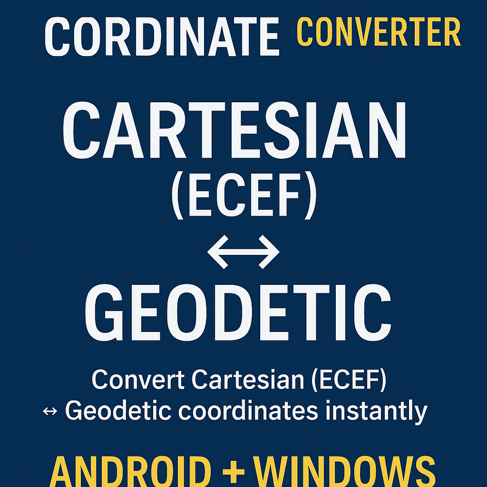 CARTES-GEO-COOR is a simple and precise coordinate converter for GNSS users. Convert between Cartesian (ECEF) and Geodetic (Latitude, Longitude, Height) formats instantly. Available for both Android and Windows. No internet required.